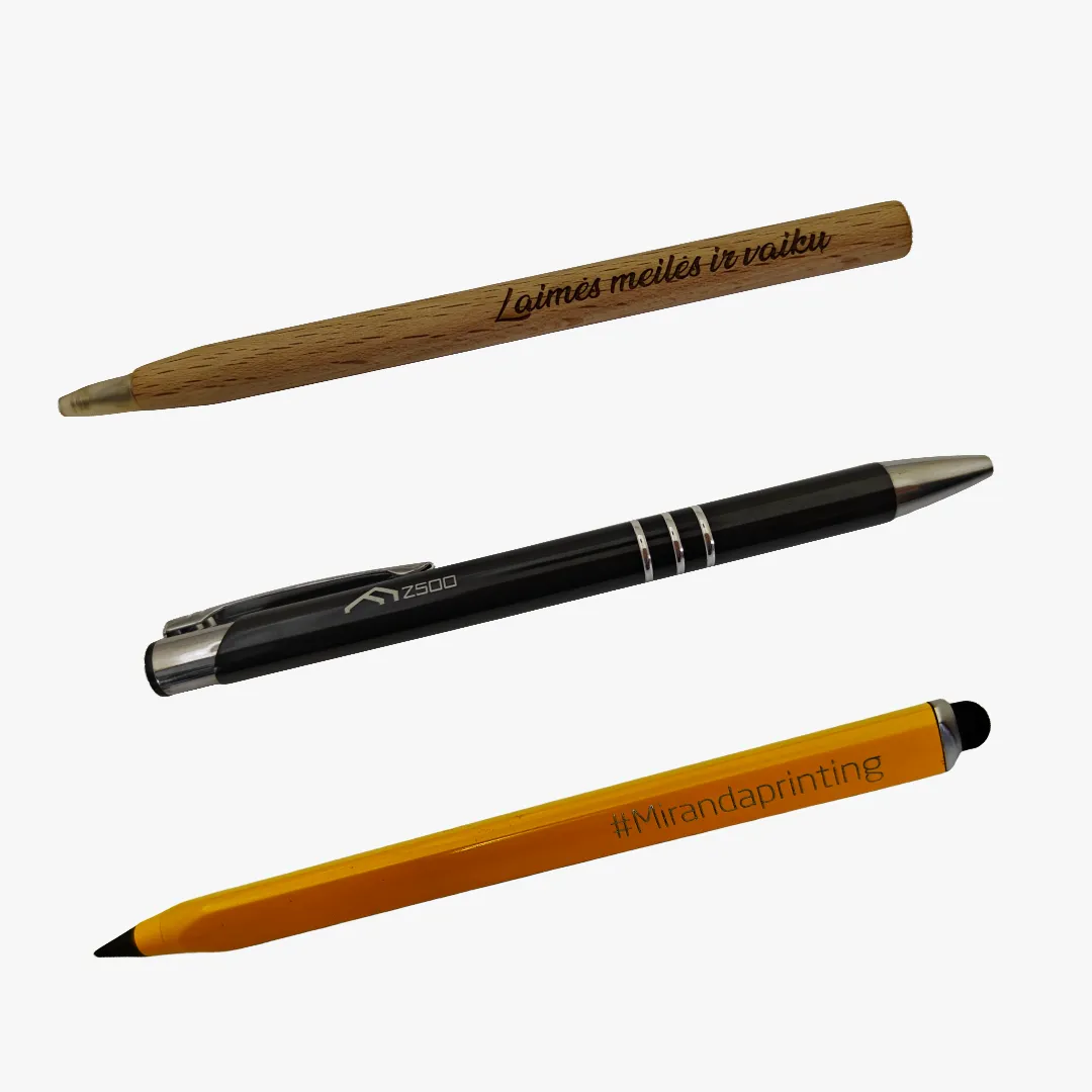 Greitai ir kokybiškai atliekame RAŠYMO PRIEMONIŲ GRAVIRAVIMO PASLAUGAS, kurios suteikia daiktui išskirtinumo ir vertės. Mūsų lazerinis graviravimas leidžia tiksliai ir kokybiškai pažymėti tiek vienetinius, tiek didesnius kiekius tušinukų ir kitų rašiklių, tinkamų tiek asmeninėms dovanoms, tiek kaip verslo dovanos ar reklaminė atributika. Siūlome platų šriftų pasirinkimą graviruotiems tušinukams – nuo elegantiškų ir klasikinių iki modernių ar rašytinių. Esant pageidavimui, galima naudoti jūsų firminį šriftą ar logotipą, taip sukuriant unikalius tušinukus su logotipu.